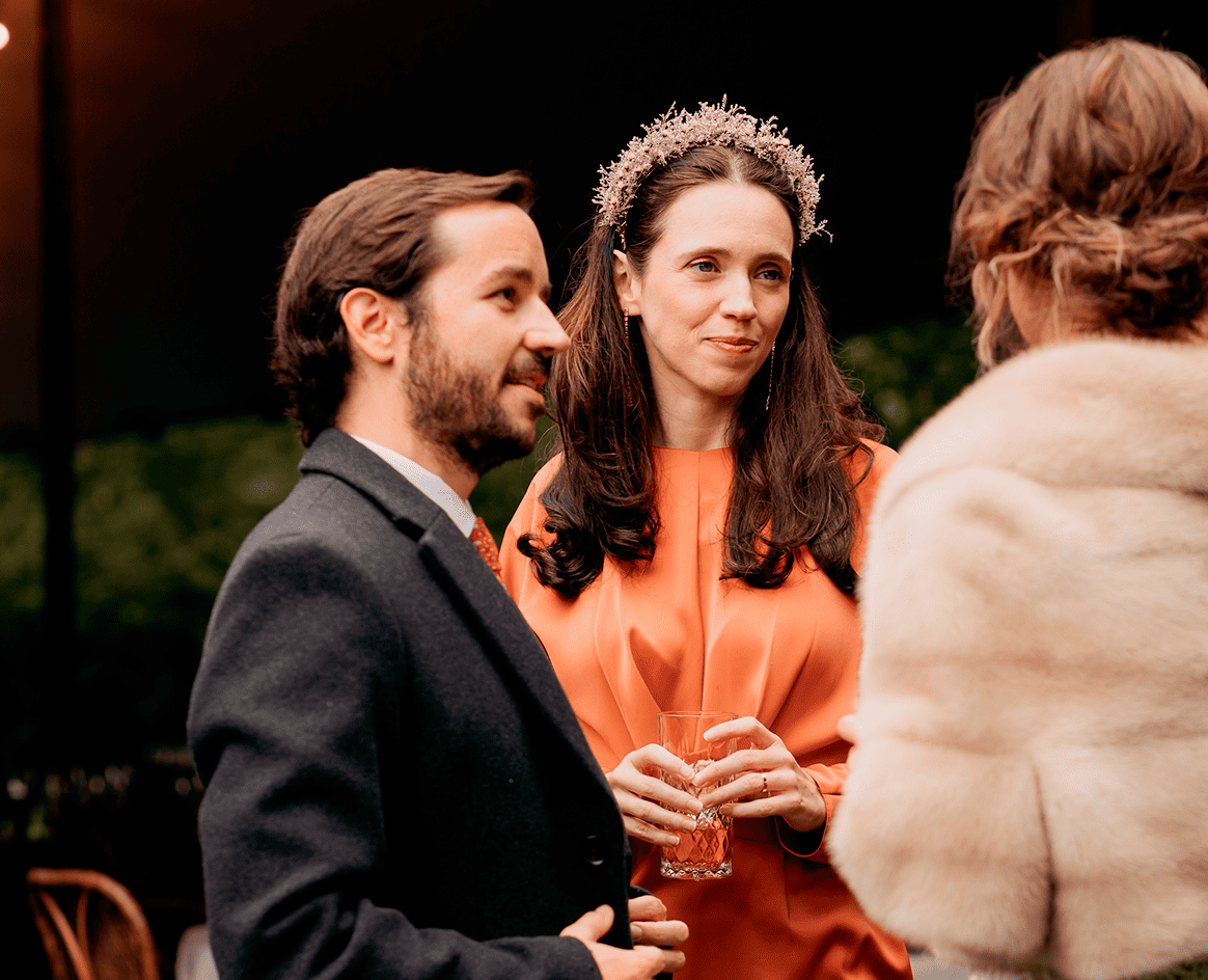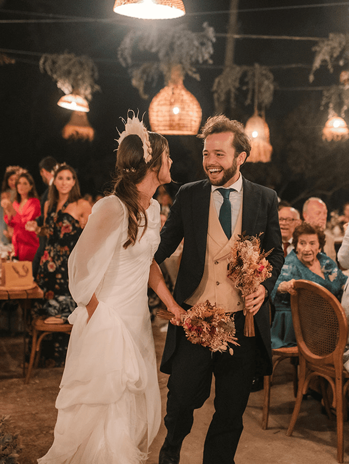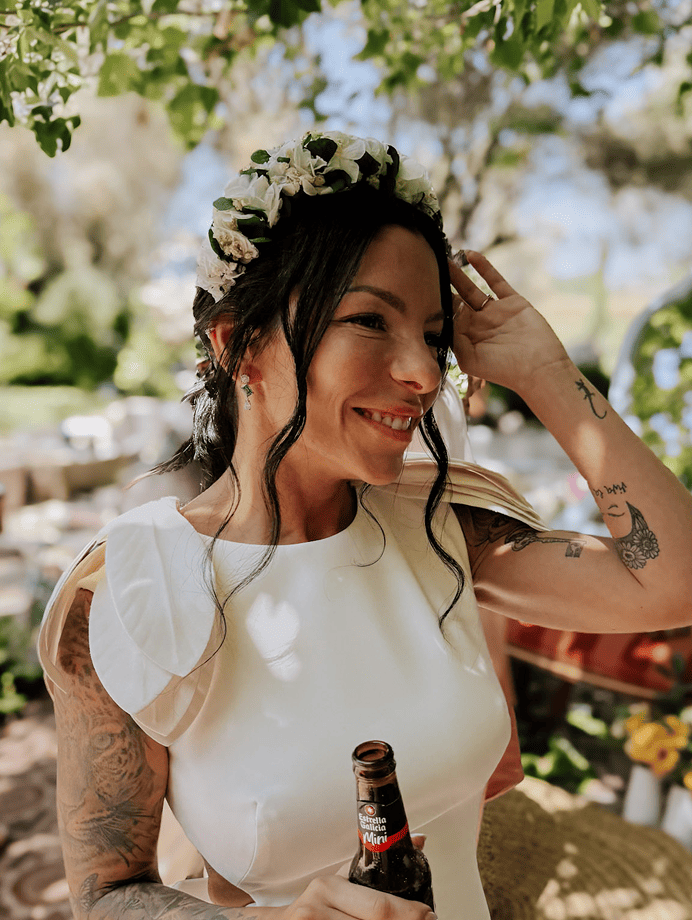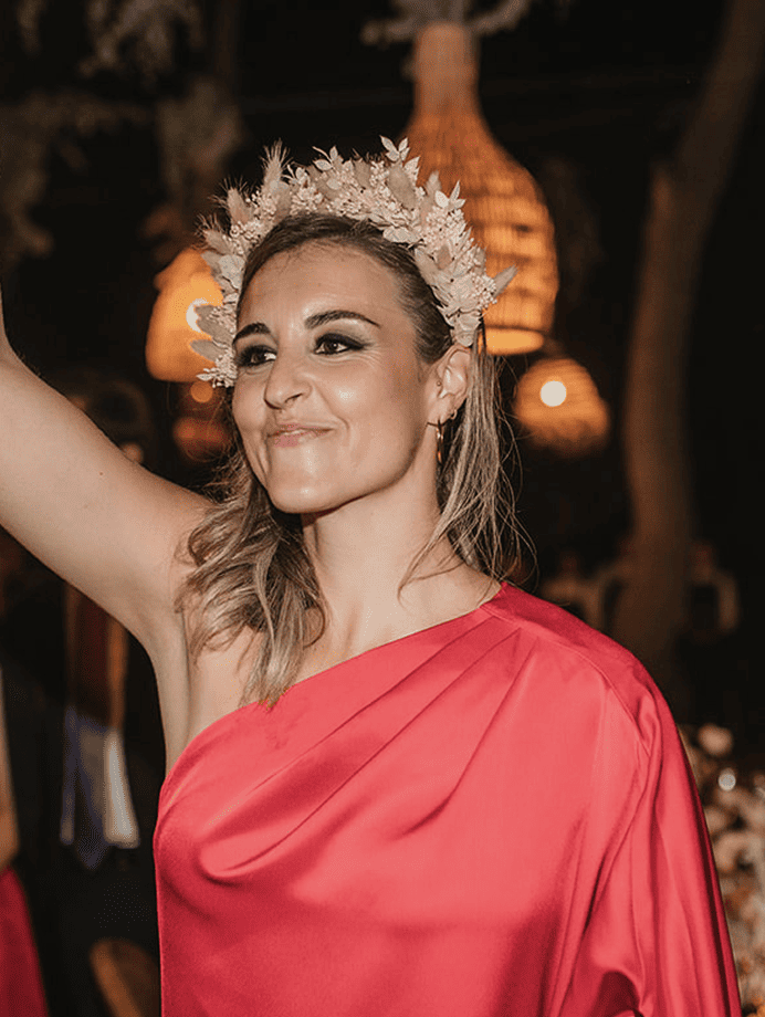 • Novia con diadema de flor preservada celebrando el banquete de su boda
