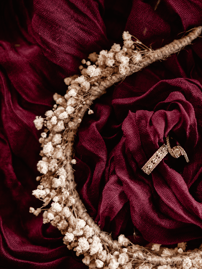 • Diadema de flor preservada en tonos neutros en bodegon con alianzas
