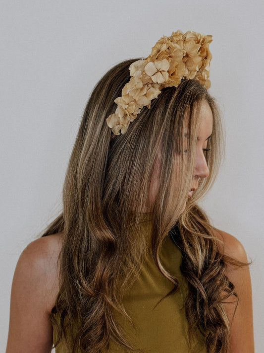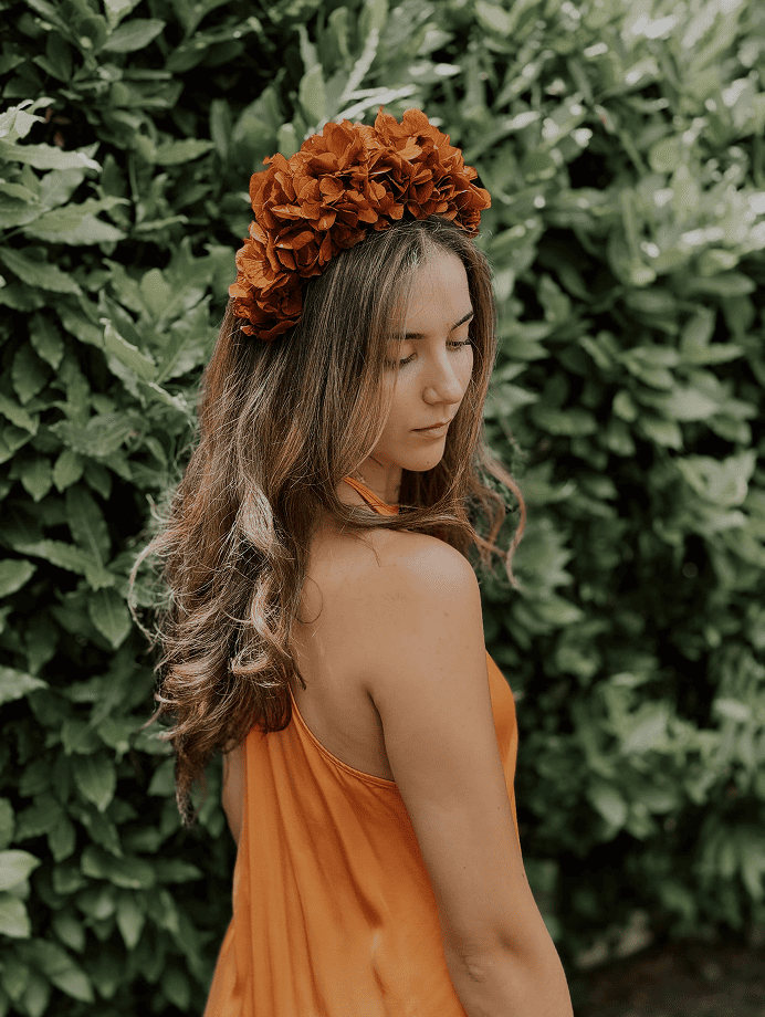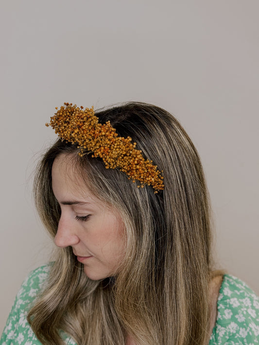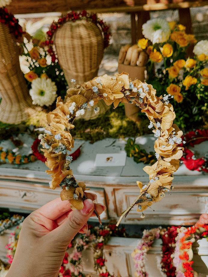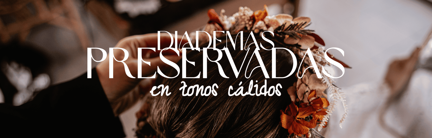 Tierra Viva: calidez en forma de diademaDiademas de flores preservadas en tonos terracota, naranja y mostaza. Su paleta cálida evoca paisajes secos, atardeceres dorados y naturaleza en estado puro. Tienen una textura orgánica, ideal para looks que buscan un punto de protagonismo con elegancia.