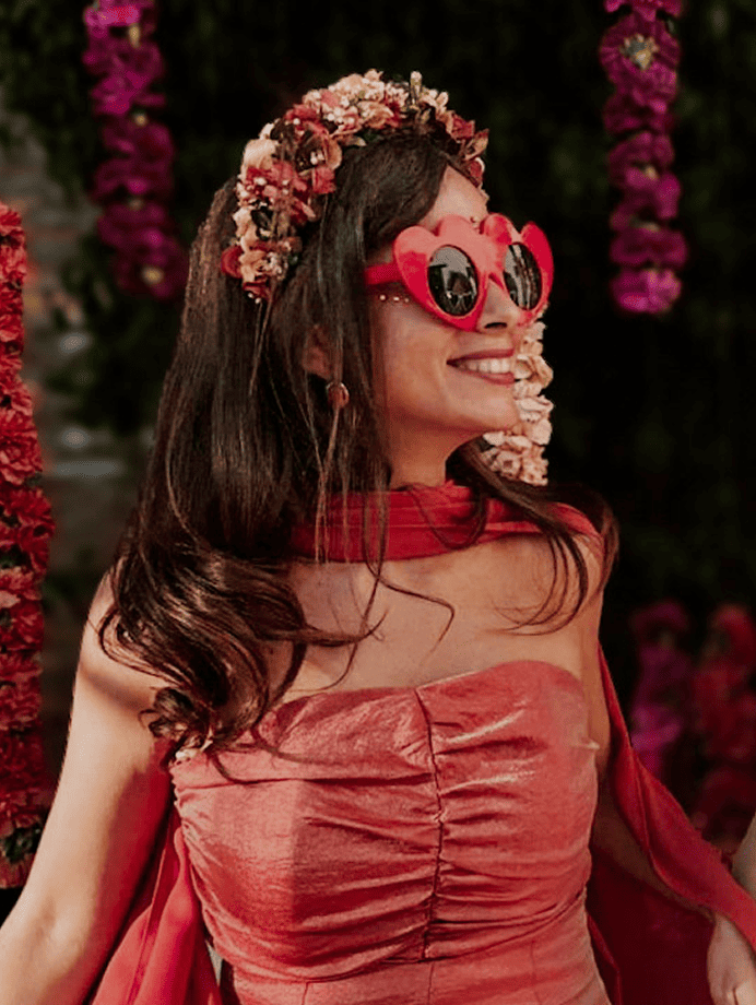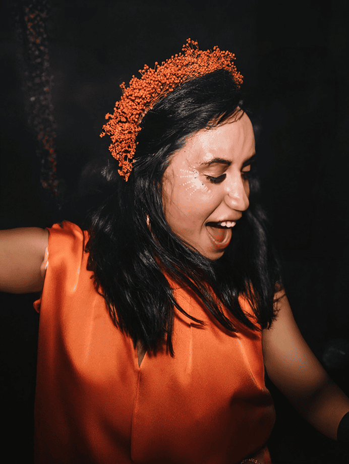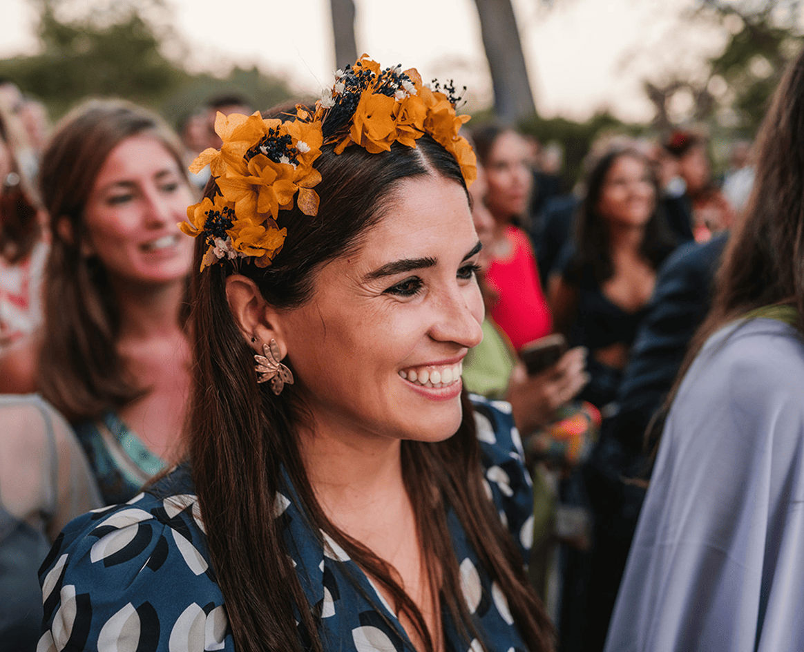 • Invitada con diadema de flor preservada en tonos cálidos en evento de noche