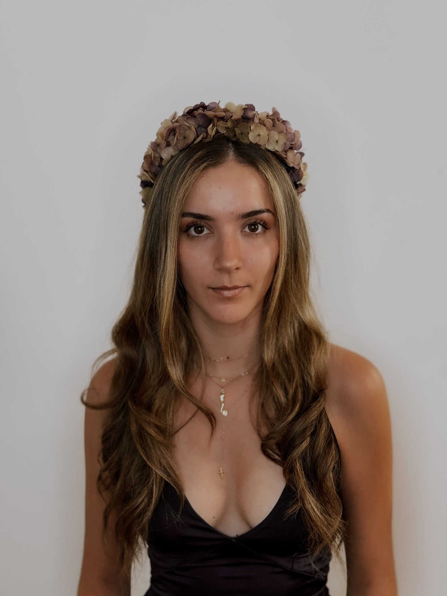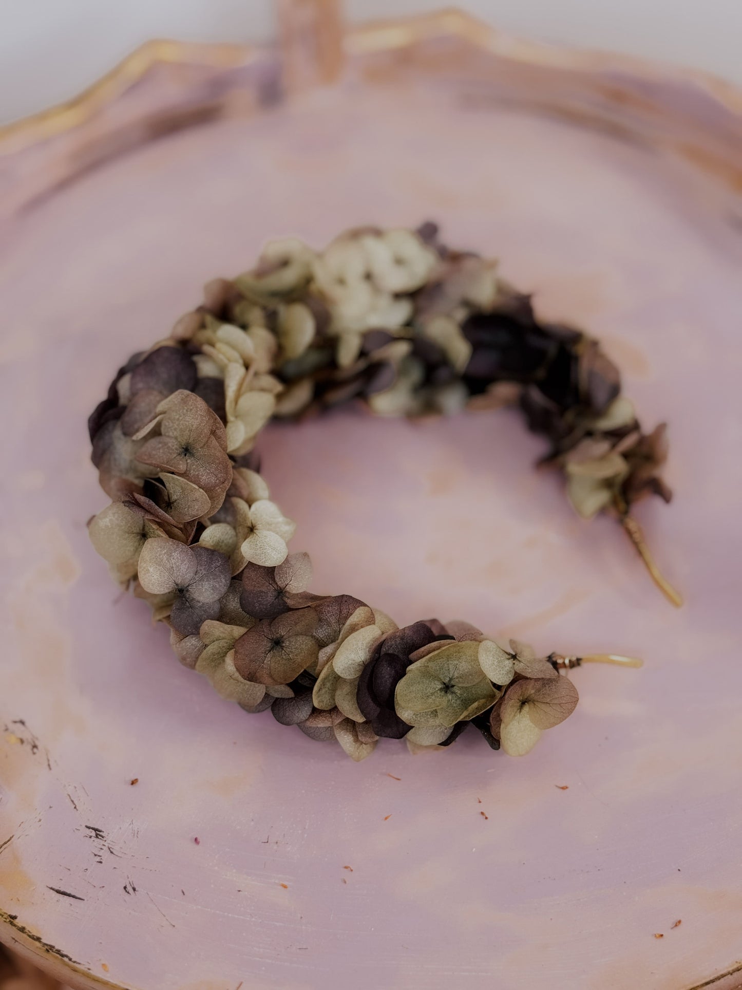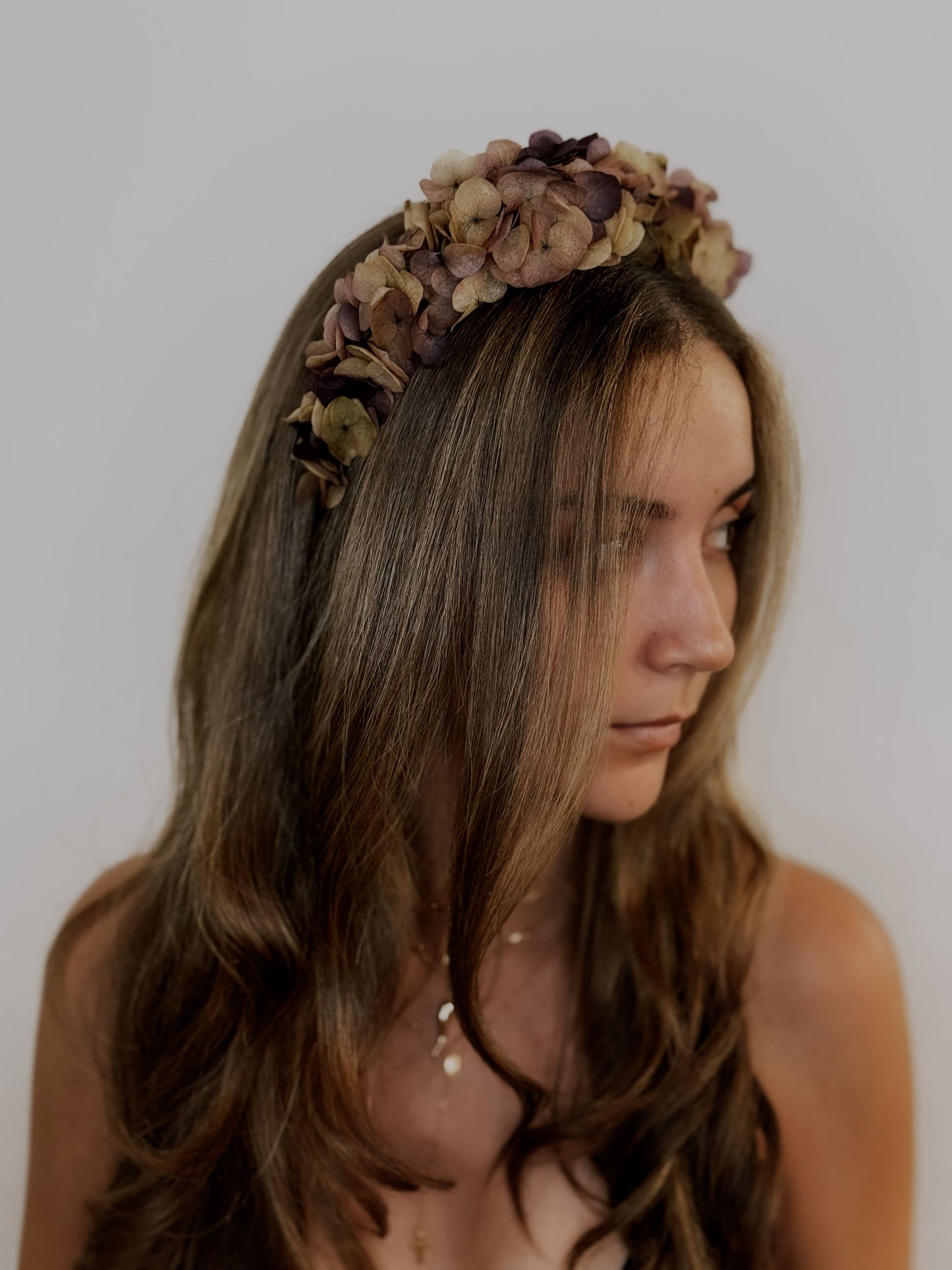El degradado de la hortensia, desde crema hasta granate, hace de esta diadema una pieza única y muy especial. Con volumen y una gama cálida y romántica, es ideal para invitadas que buscan un detalle diferente pero discreto a la vez.