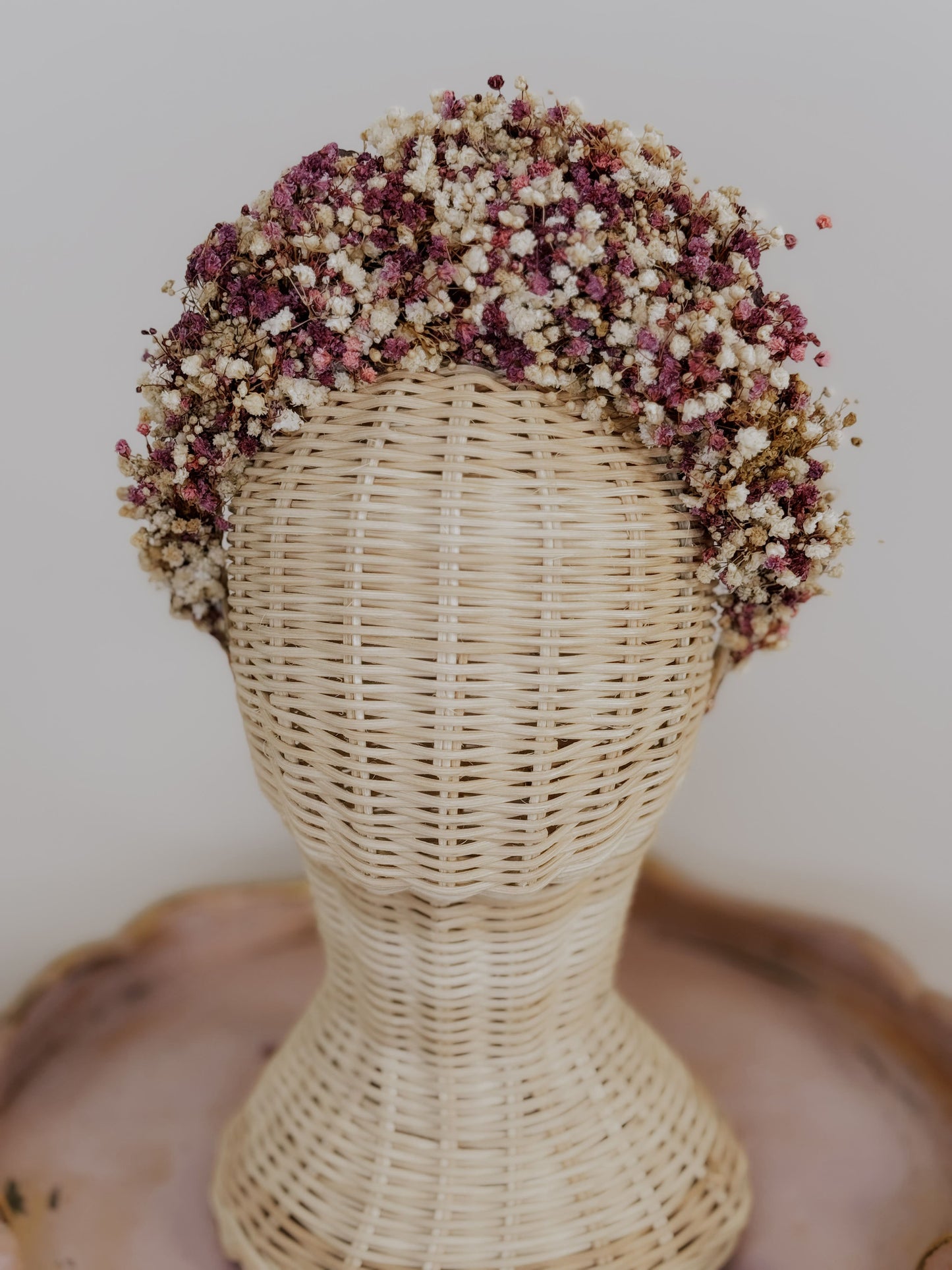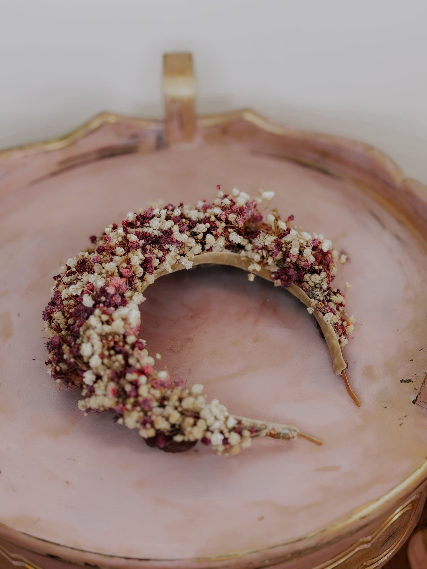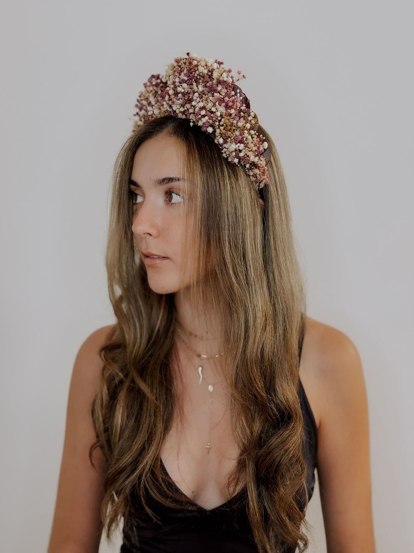 Una diadema con mezcla de tonos cálidos y suaves. La paniculata preservada en crema, blanco y distintos matices de rosa da como resultado una pieza armónica, con volumen y movimiento. Femenina, dulce y muy especial.