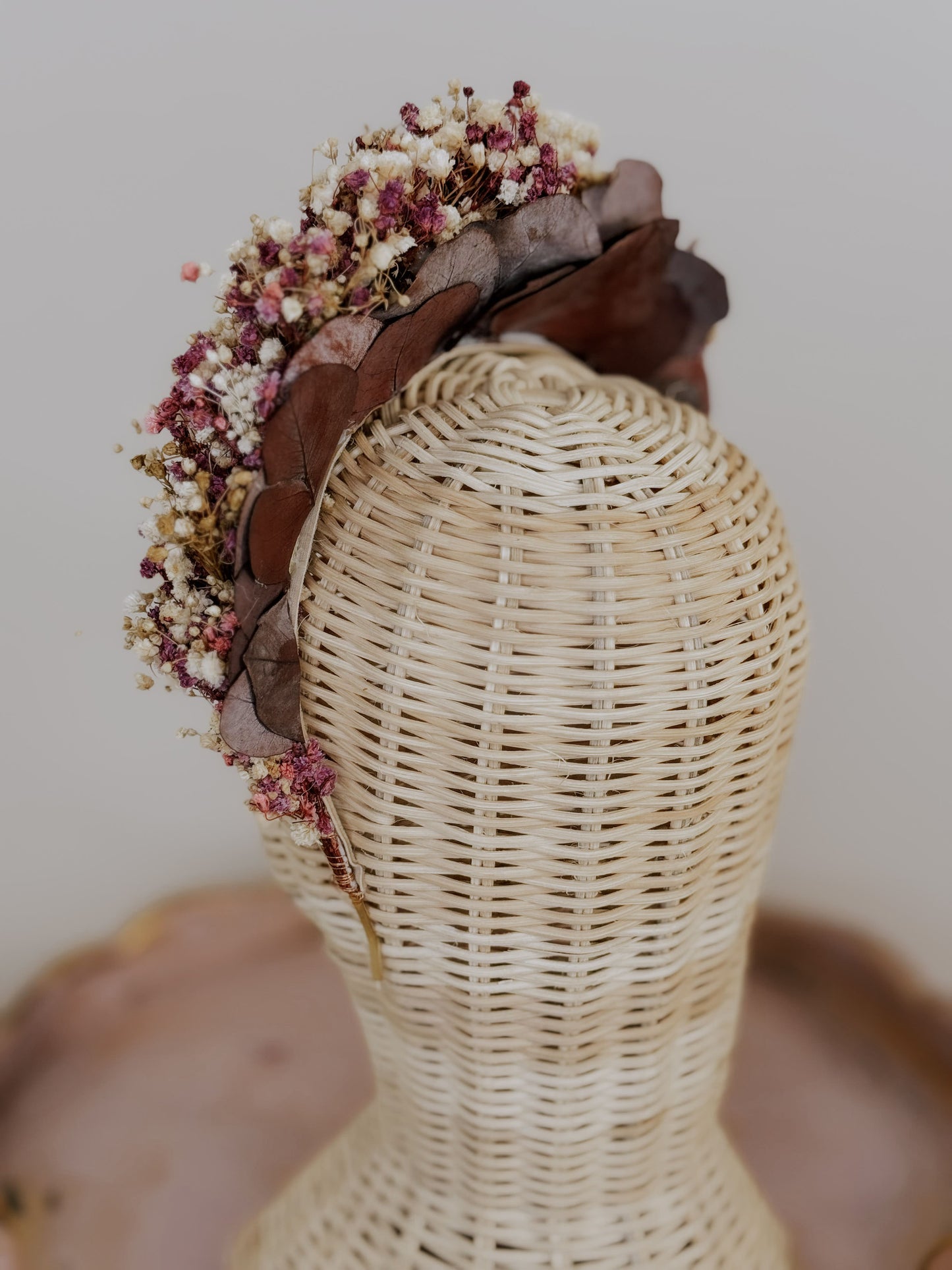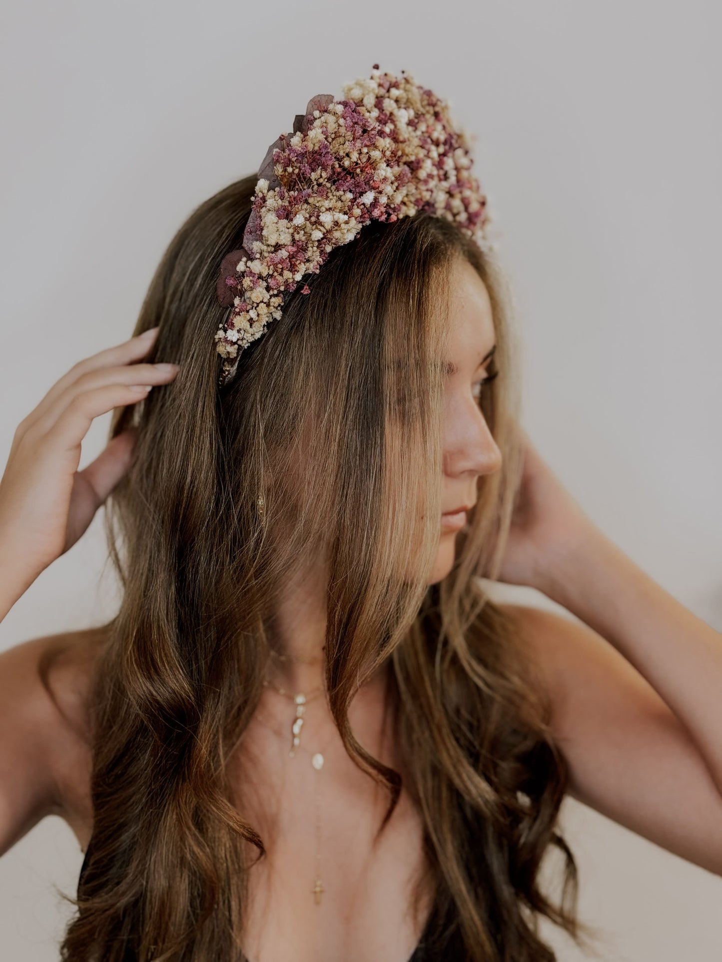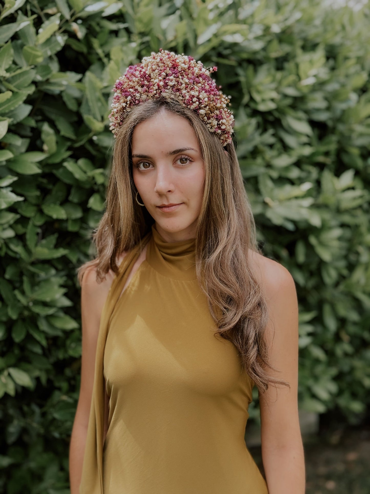 Una diadema con mezcla de tonos cálidos y suaves. La paniculata preservada en crema, blanco y distintos matices de rosa da como resultado una pieza armónica, con volumen y movimiento. Femenina, dulce y muy especial.