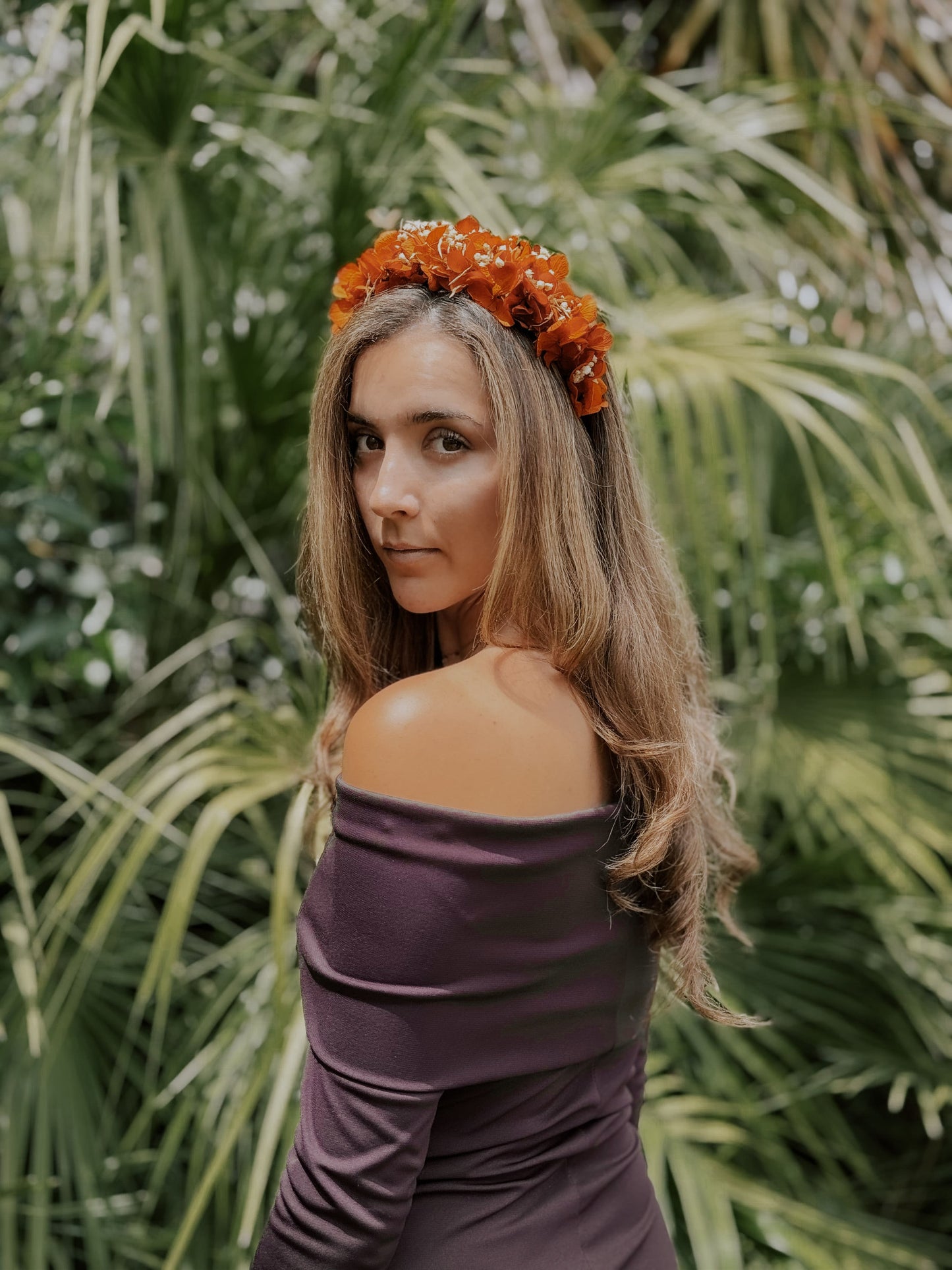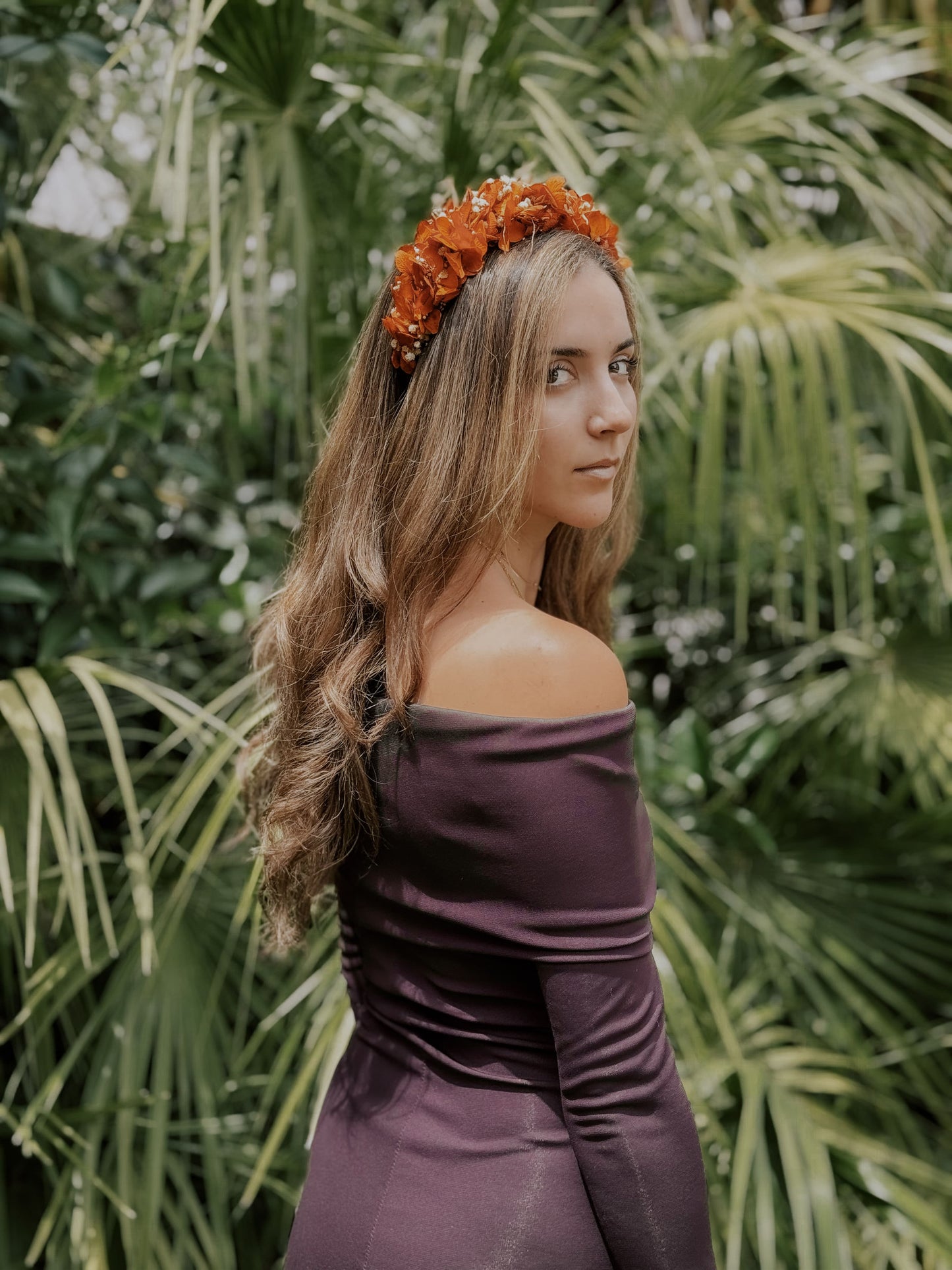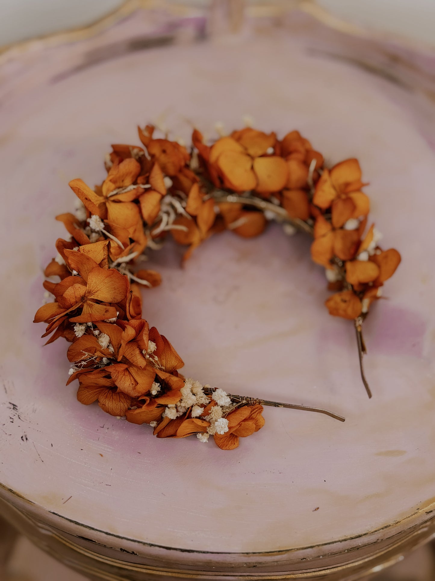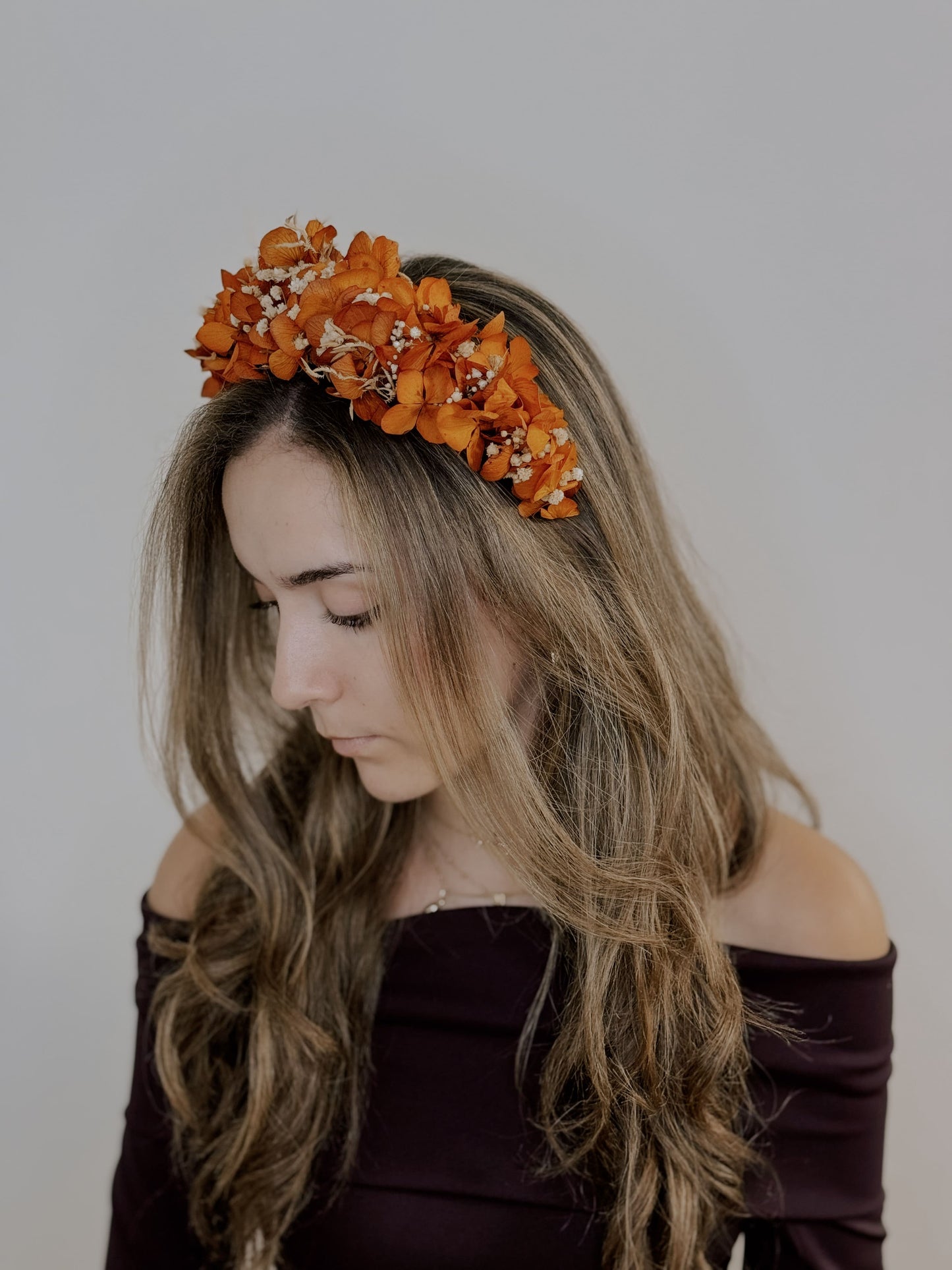 Una combinación vibrante y elegante. La hortensia preservada naranja se equilibra con la suavidad de la paniculata blanca, creando una diadema con presencia pero fácil de lucir. Perfecta para invitadas que buscan un toque de color.
