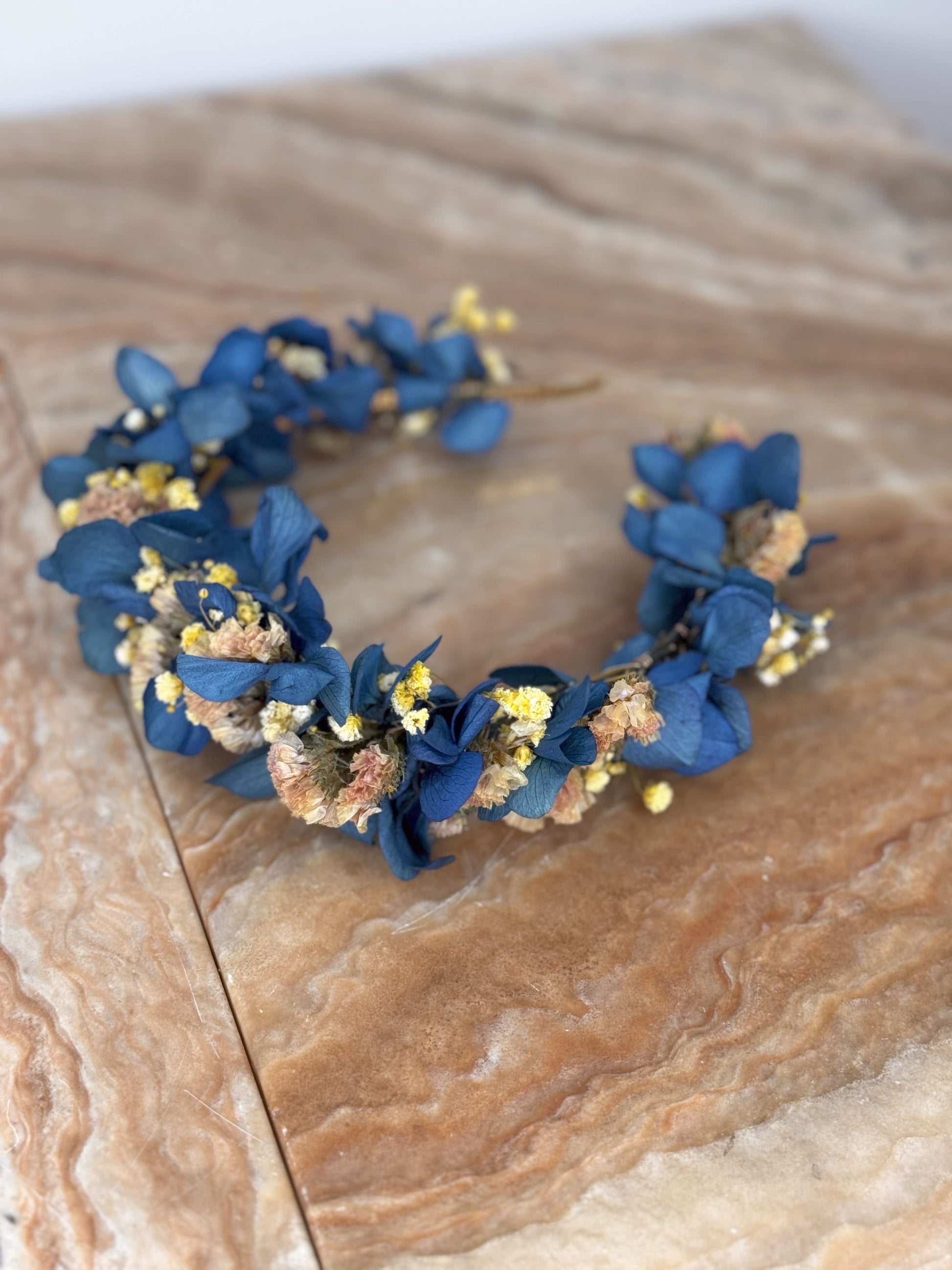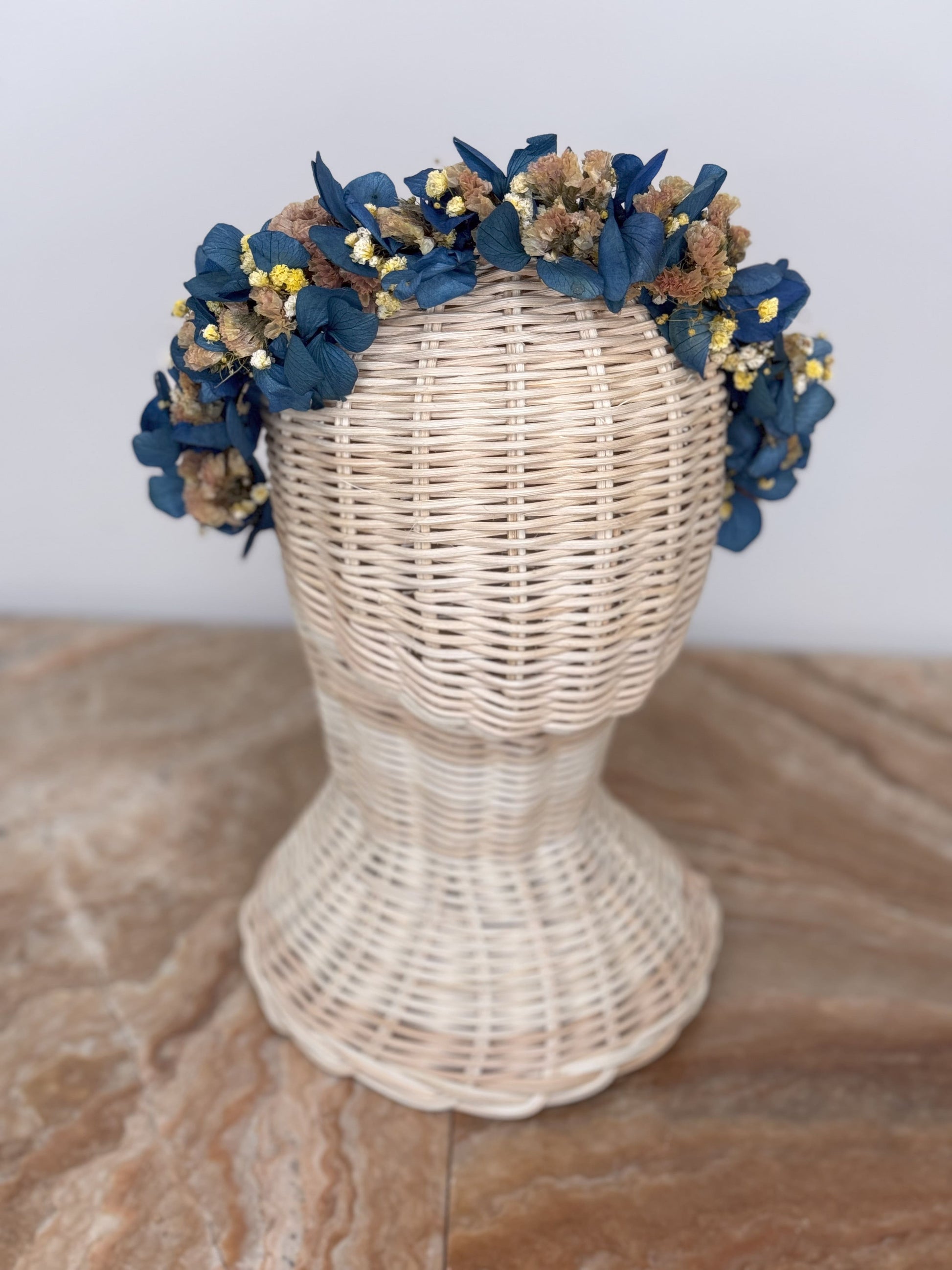 La hortensia preservada con un azul oscuro intenso destaca junto al statice preservado en rosa empolvado y la paniculata preservada amarilla, creando una diadema de flores preservadas con personalidad. Ideal para invitadas que no temen romper esquemas y apostar por una mezcla poco común que atrapa a primera vista.