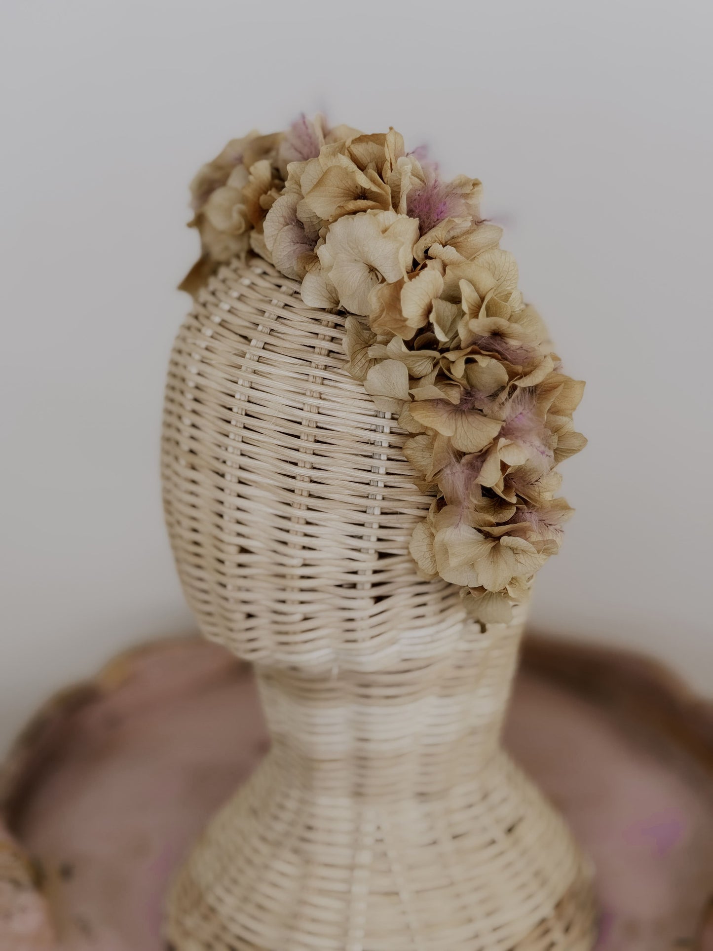 Diseño sencillo pero con presencia. La hortensia crema se acompaña de plumina lila, dando como resultado una pieza ligera, elegante y con un toque diferente. Perfecta para invitadas que apuestan por los detalles con personalidad.