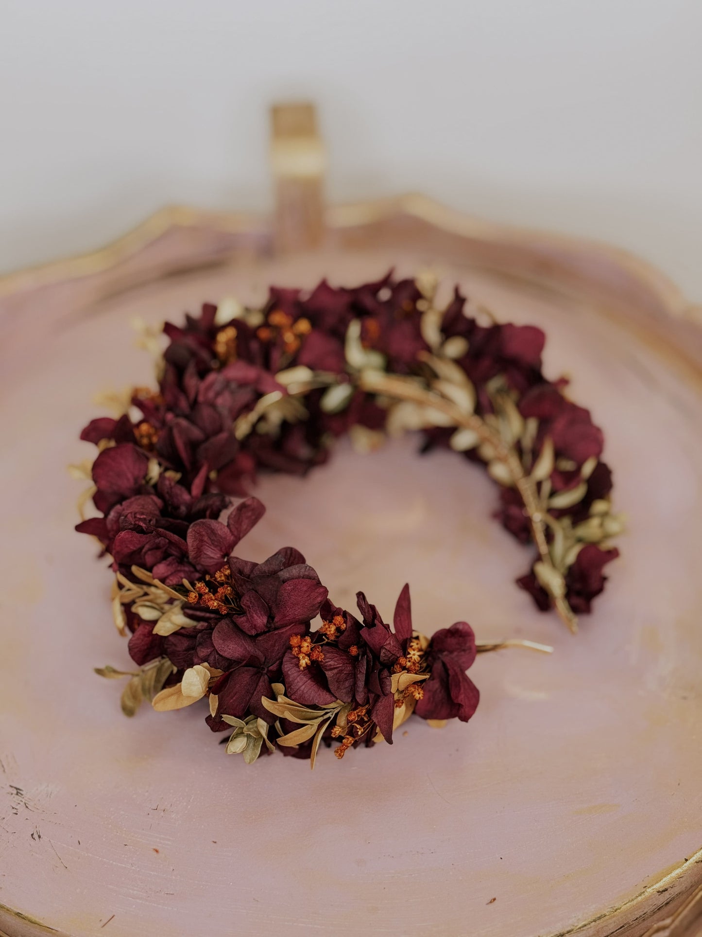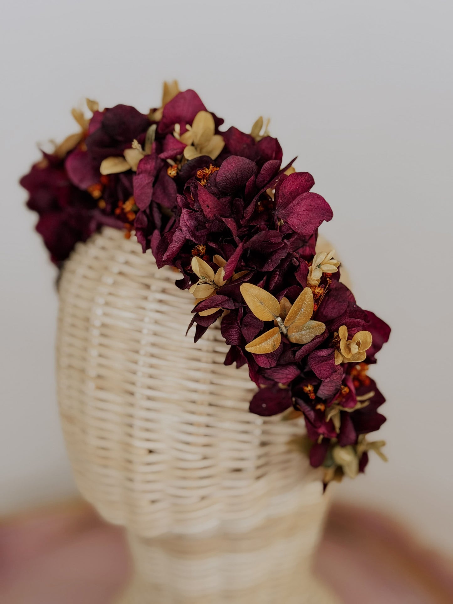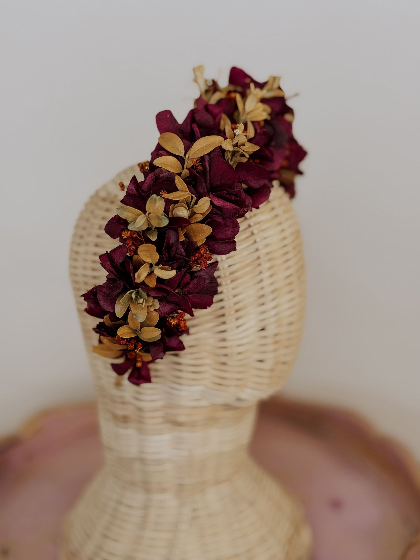 Tonos profundos y cálidos que marcan estilo. La hortensia granate se une al lentisco amarillento, aportando textura y contraste. Una diadema con fuerza visual y aire otoñal, perfecta para destacar.