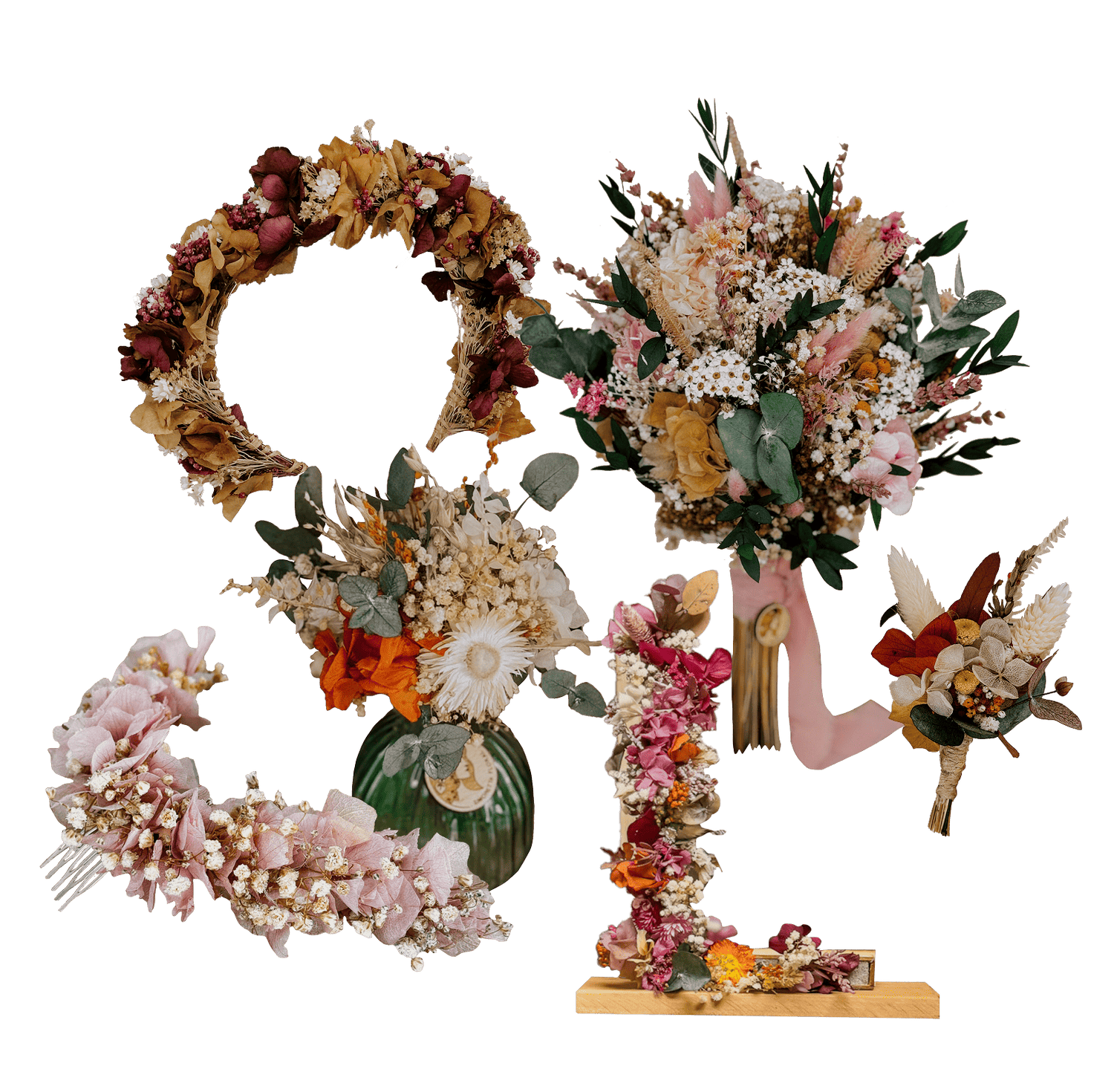 Además, puedes elegir entre nuestras tonalidades Premium pastel o Standard, o pedirla a juego con tu ramo de novia original, logrando una réplica ramo con flores específicas (rosas, eucalipto, paniculata, etc.) totalmente personalizada.