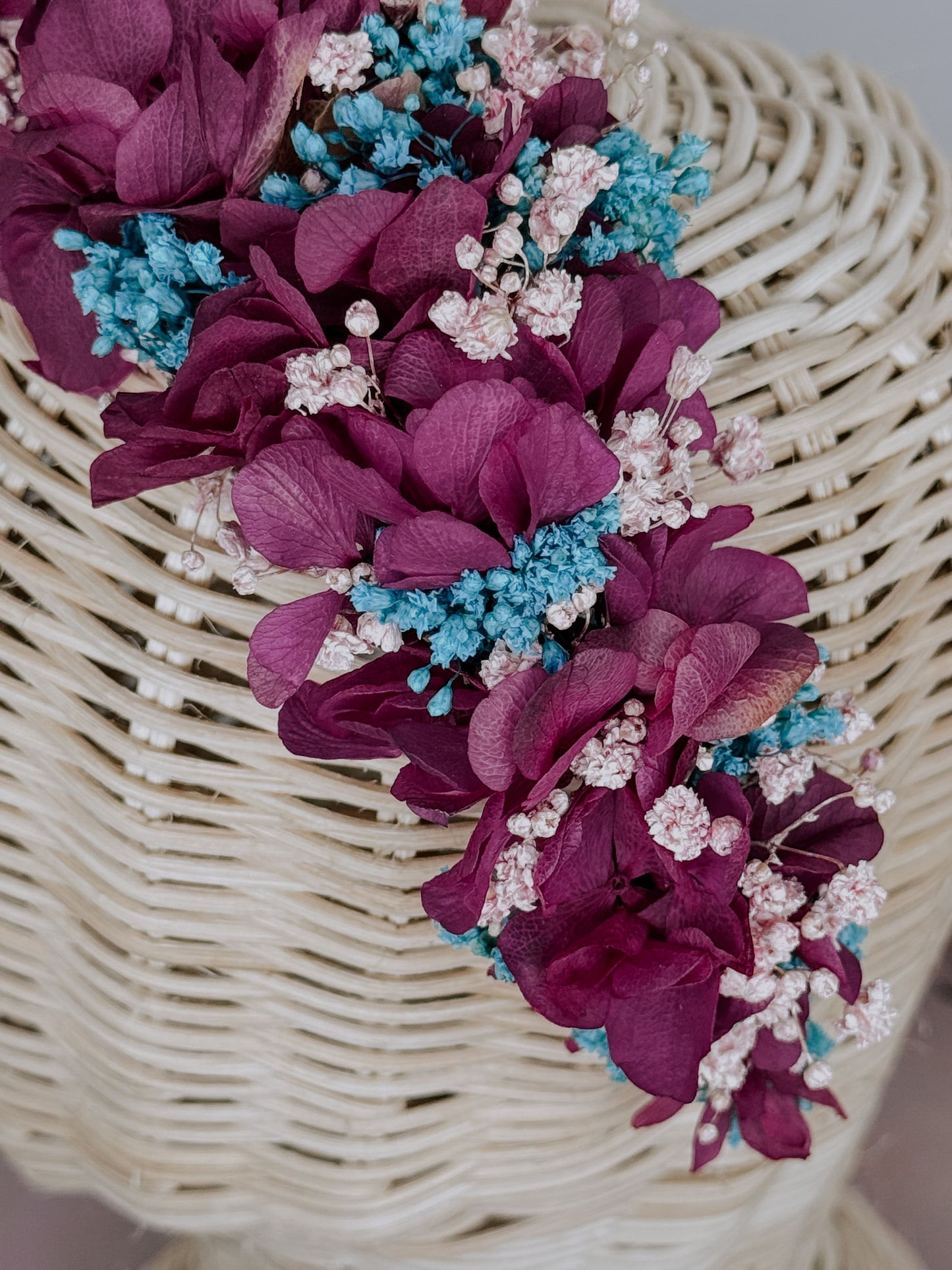 Una explosión floral elegante y expresiva. Hortensia en tono magenta junto con paniculata rosa claro y azul claro crean una pieza alegre pero con carácter. Ideal para looks florales con personalidad.