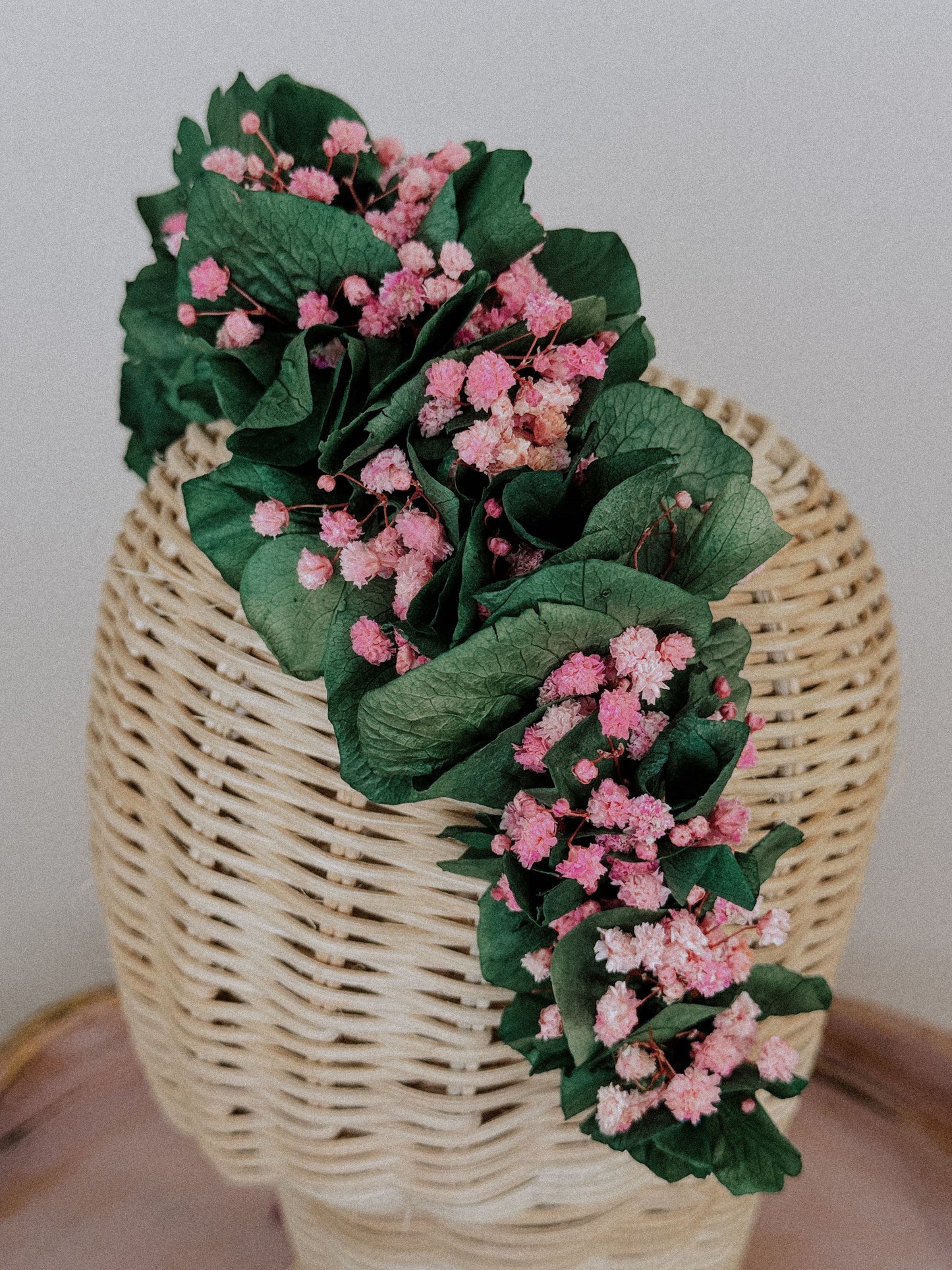 Una corona preservada completamente silvestre y con un gran impacto visual. Compuesta por eucalipto, hortensia naranja, botão amarillo, helecho, avena, broom blanco y glixia blanca. Un diseño lleno de matices y texturas para invitadas que buscan un complemento natural, impactante y lleno de vida.