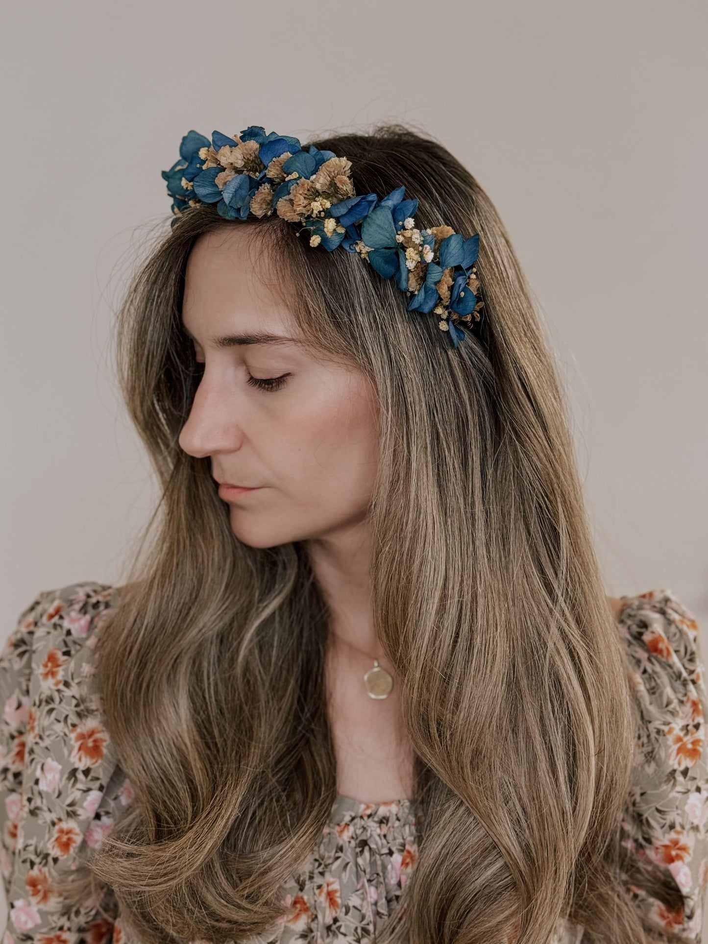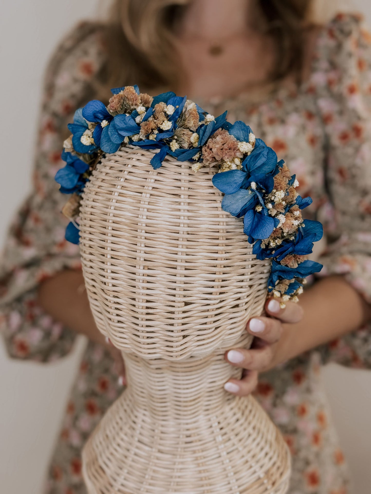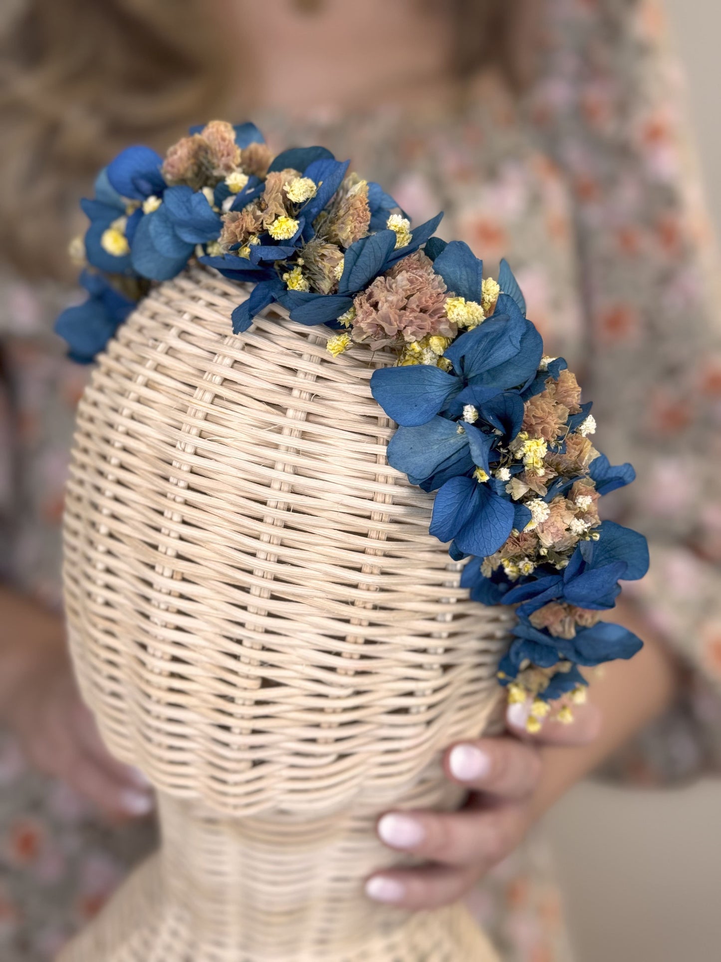 La hortensia preservada con un azul oscuro intenso destaca junto al statice preservado en rosa empolvado y la paniculata preservada amarilla, creando una diadema de flores preservadas con personalidad. Ideal para invitadas que no temen romper esquemas y apostar por una mezcla poco común que atrapa a primera vista.