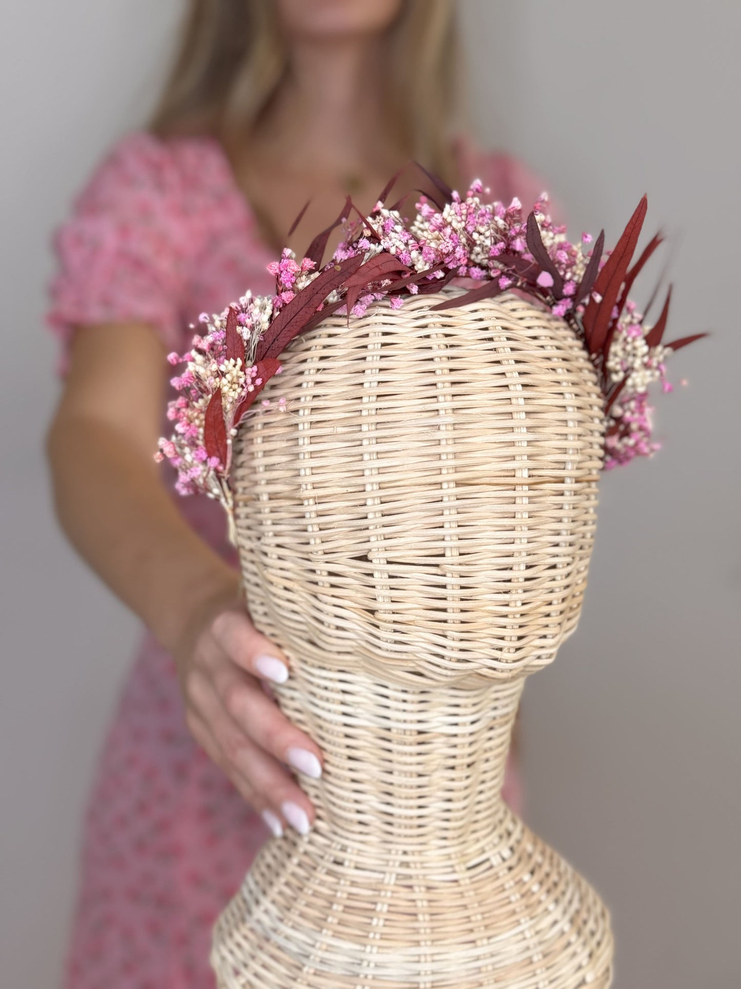 Esta diadema preservada llena de sofisticación une el eucalipto granate con paniculata blanca y rosa. Creando un contraste de tonos y texturas que envuelve a esta pieza tan especial e impactante, perfecta para bodas de tarde o eventos más elegantes.