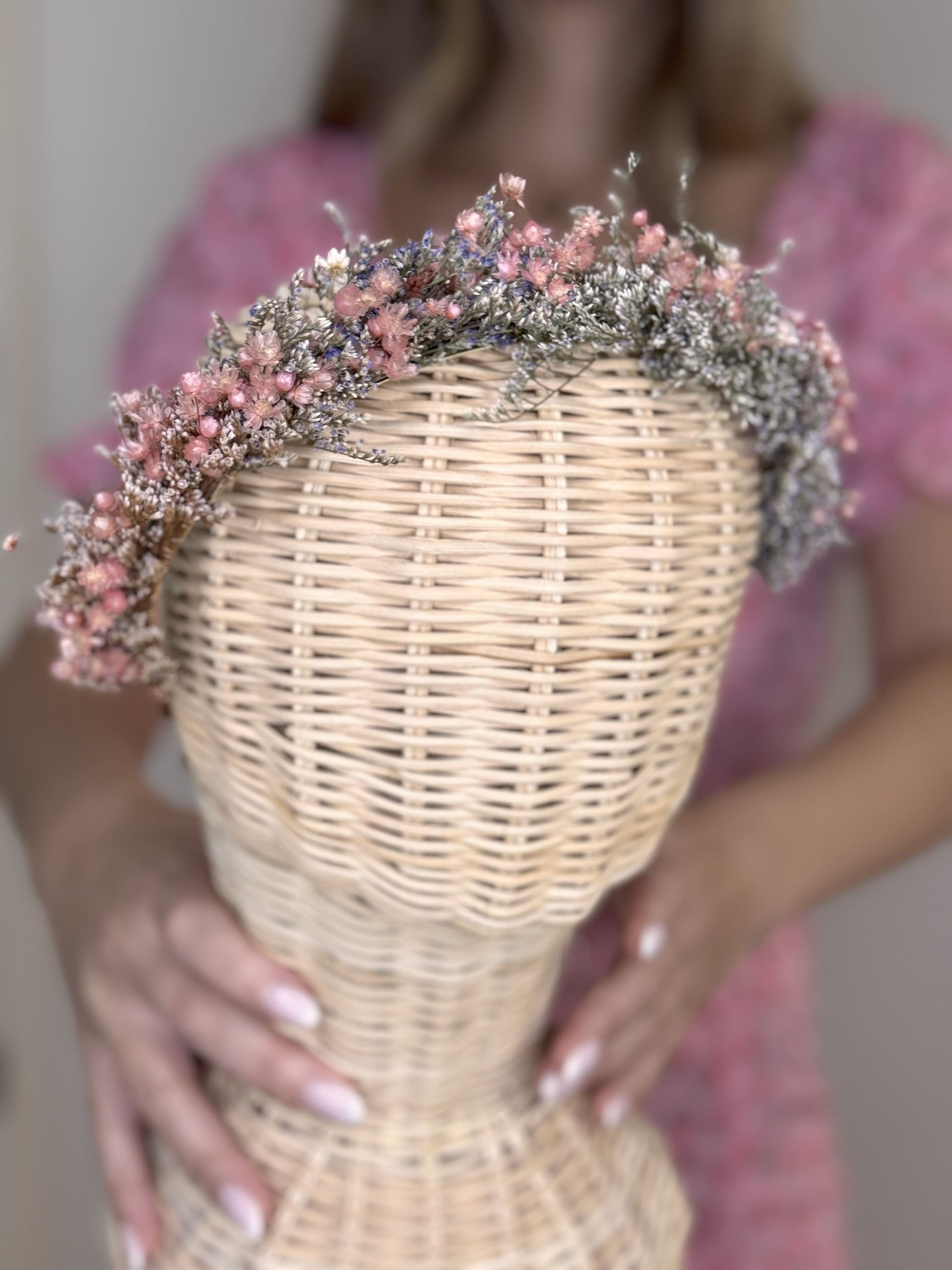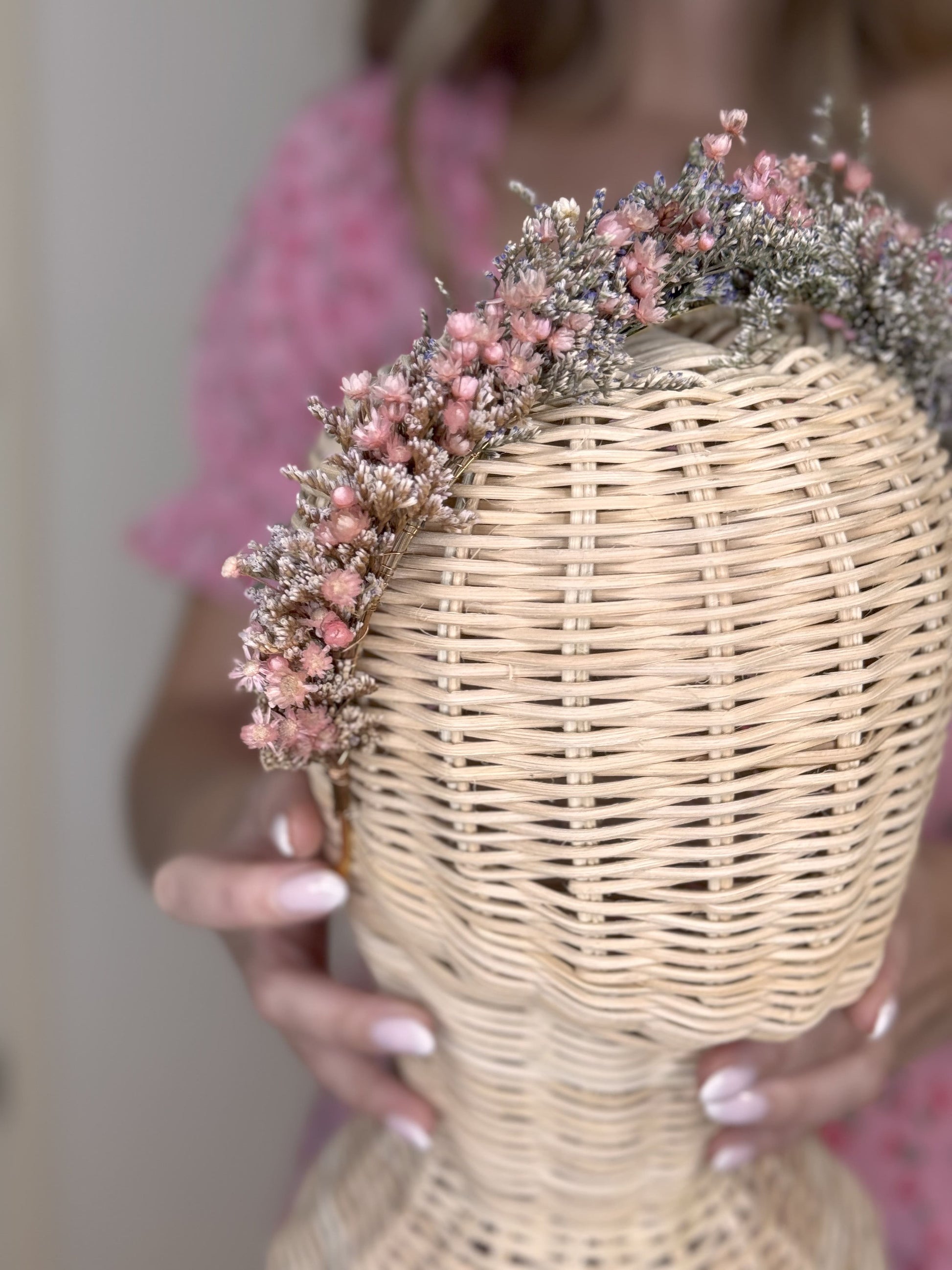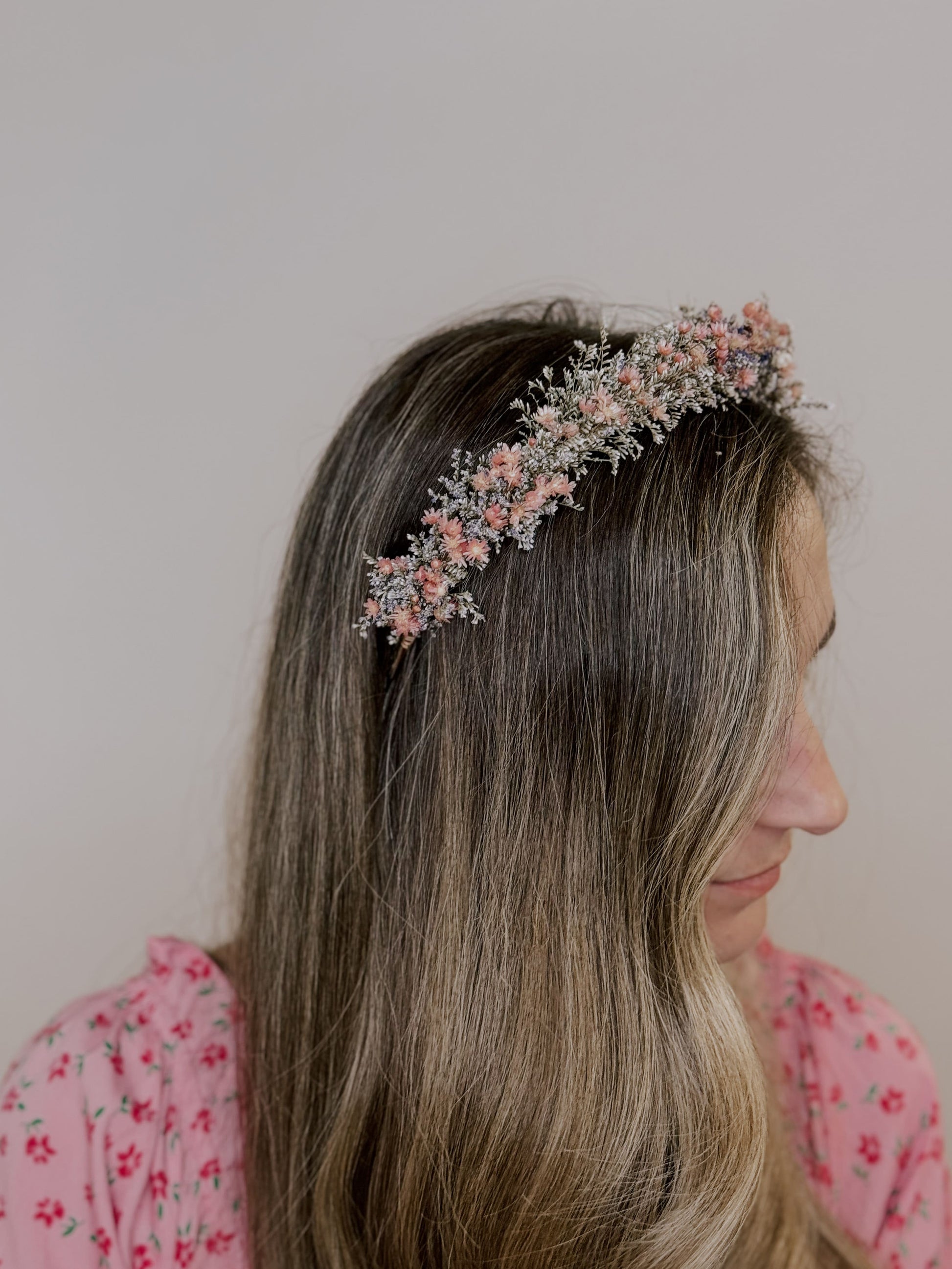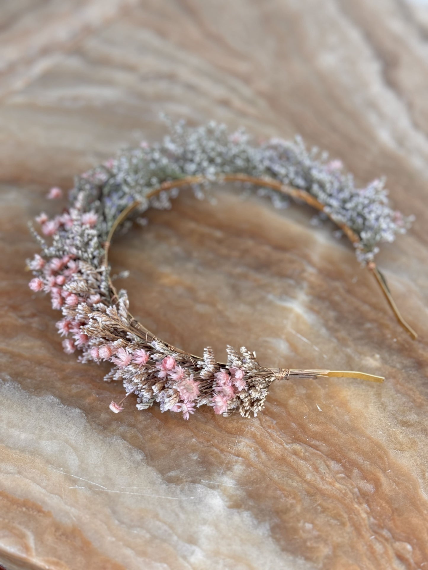 Natural, fresca y con encanto. Las hojas de limonium aportan la sensación silvestre, sin embargo, las glixias preservadas rosas añaden color. Una diadema para los que desean un accesorio alegre con un toque de frescura.