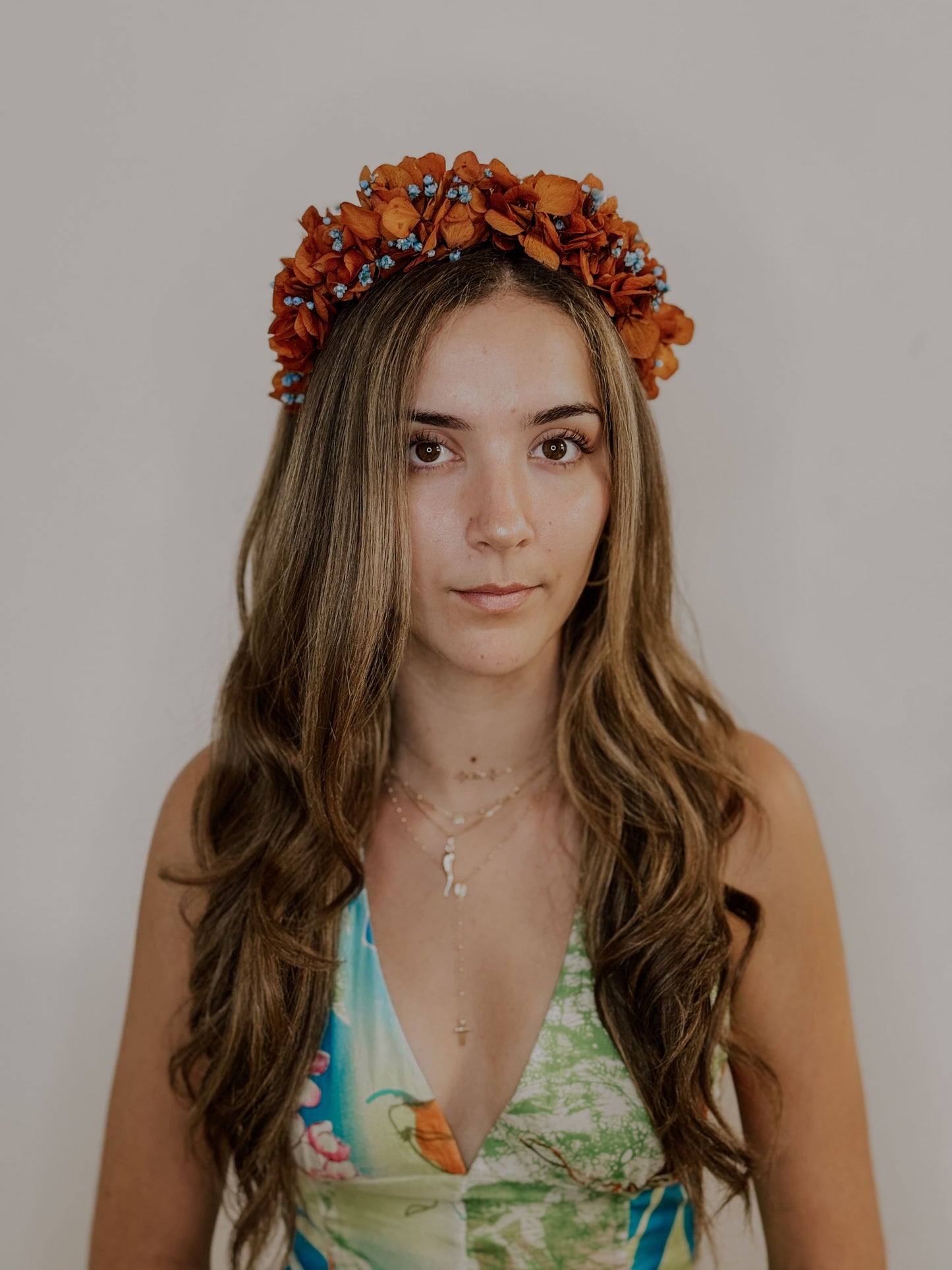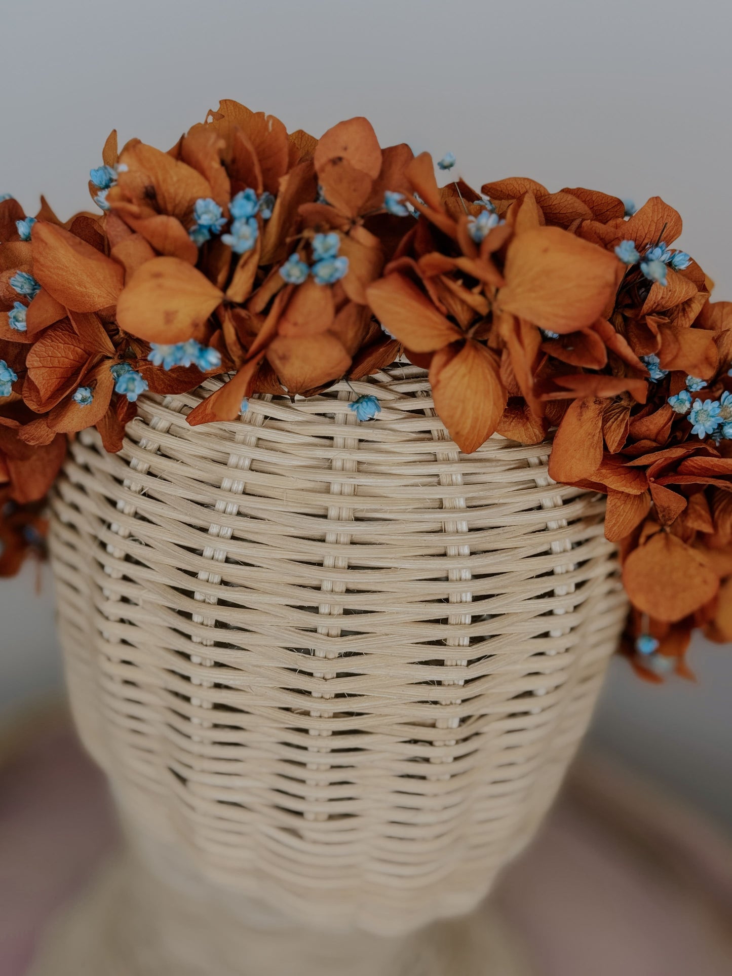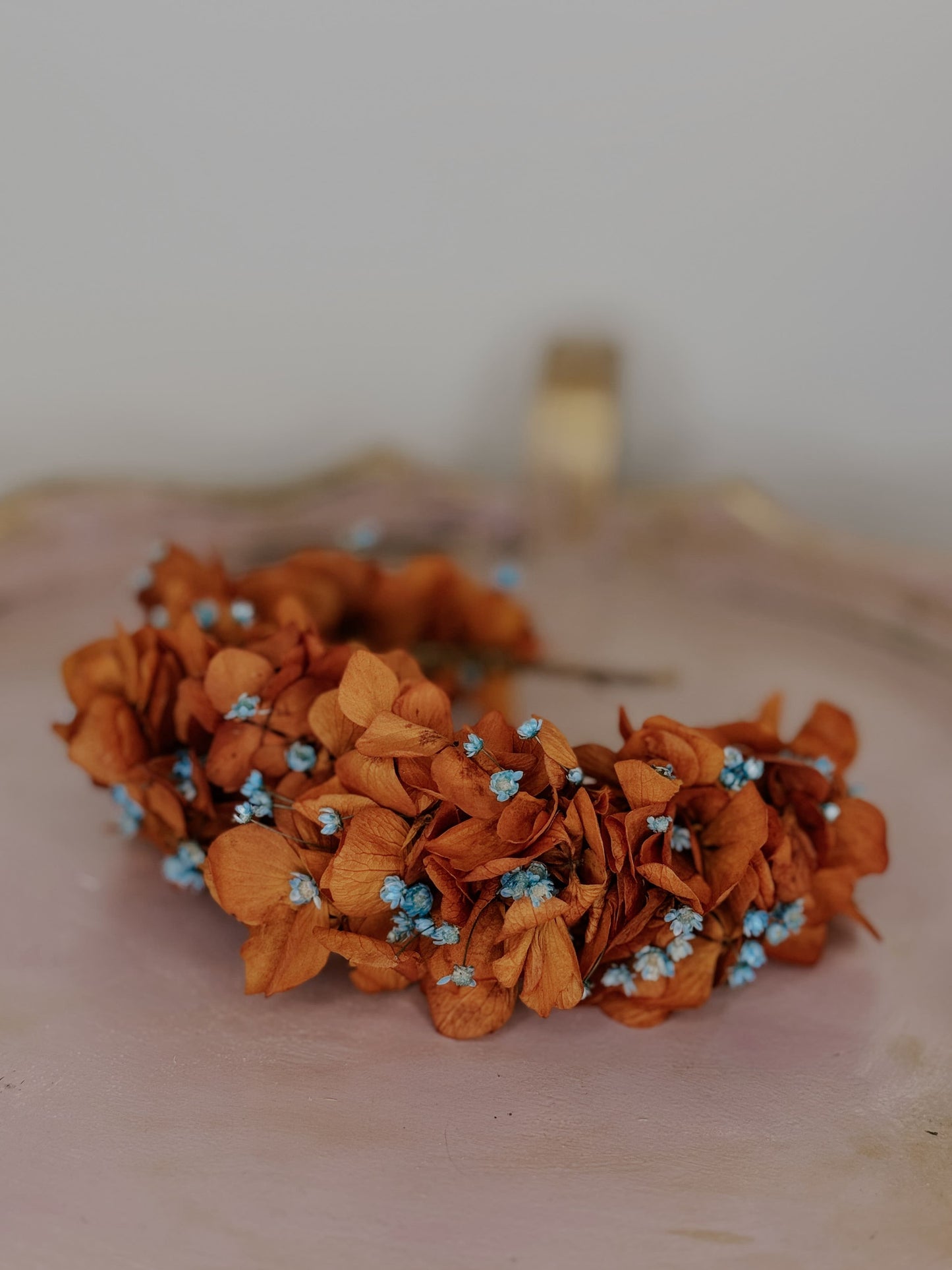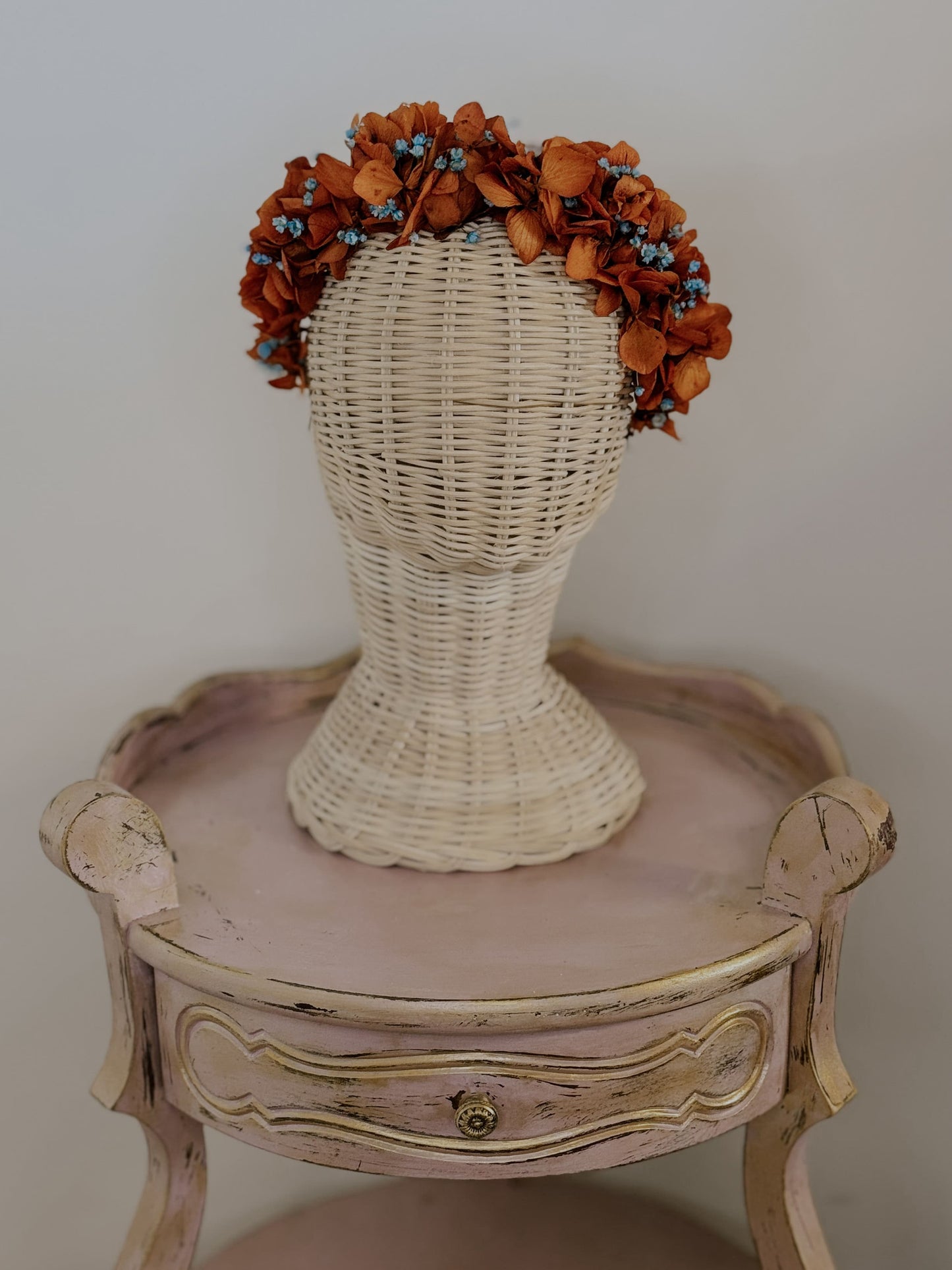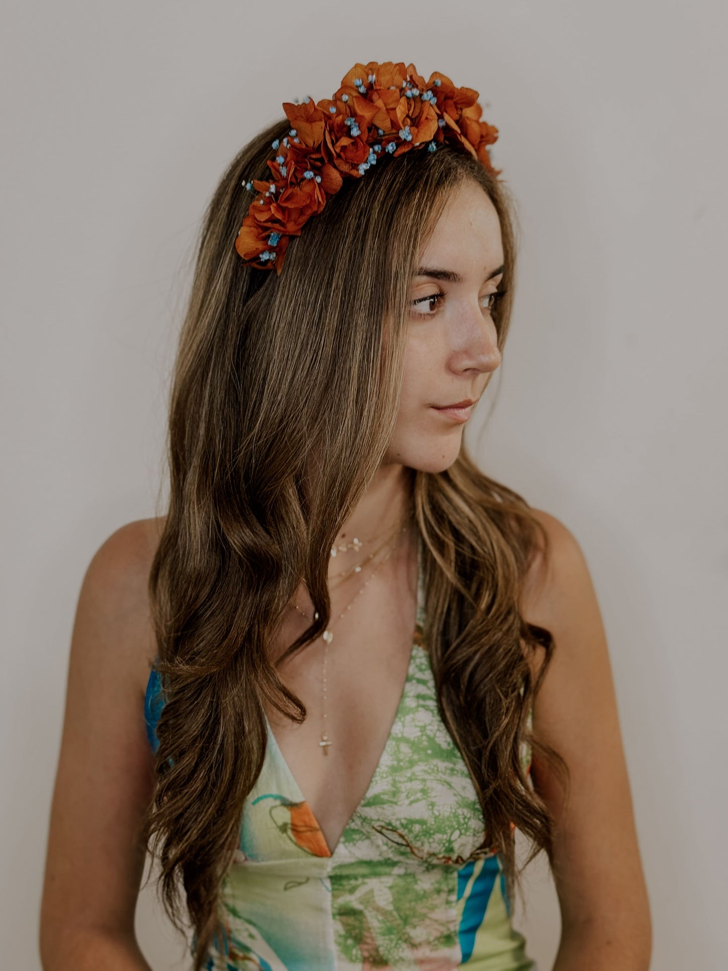 Combinación fresca y atrevida. La hortensia naranja se equilibra con la suavidad de la paniculata azul claro, dando lugar a una diadema luminosa y con un toque de color muy actual.